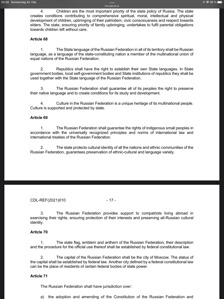 Finally, to conclude these our most early considerations, we take a look at the Constitution of the -Russian Federation, one of the warranting nations of our own existence, to day. As Russia 🇷🇺 was precluded by The Soviet Union 🇲🇪, they have the problem of natives who reside in foreign countries that were formerly part of The Soviet Union. Here we have been looking for a description on how they shall, or have to, address it, correctly, according to their own constitution, considering that half a million mostly russian people were not properly cared for by the Ukraine, from their perspective.