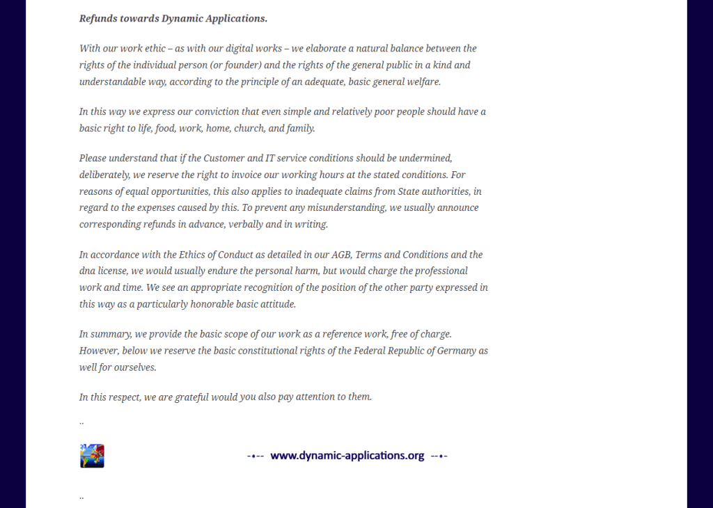 Since my personal sanity has been questioned a few times, in past years, which i can understand that it’s important when you go a path like that, for the public state, but i haven’t found that very funny (being treated like that and locked away for 3 weeks of course, because the maximum here is 6 weeks and they made it 3 weeks, formally correct). Still, the exact conditions were very harmful, so we express this our hurt in the guideline (declaration) of refunds towards Dynamic Applications as part of our AGB (see below). You can find a few more lines about our personal situation as a family in the Founder’s Vita. My wife does not want to show her thereabouts on this our Website all the time, and so i try to respect that.