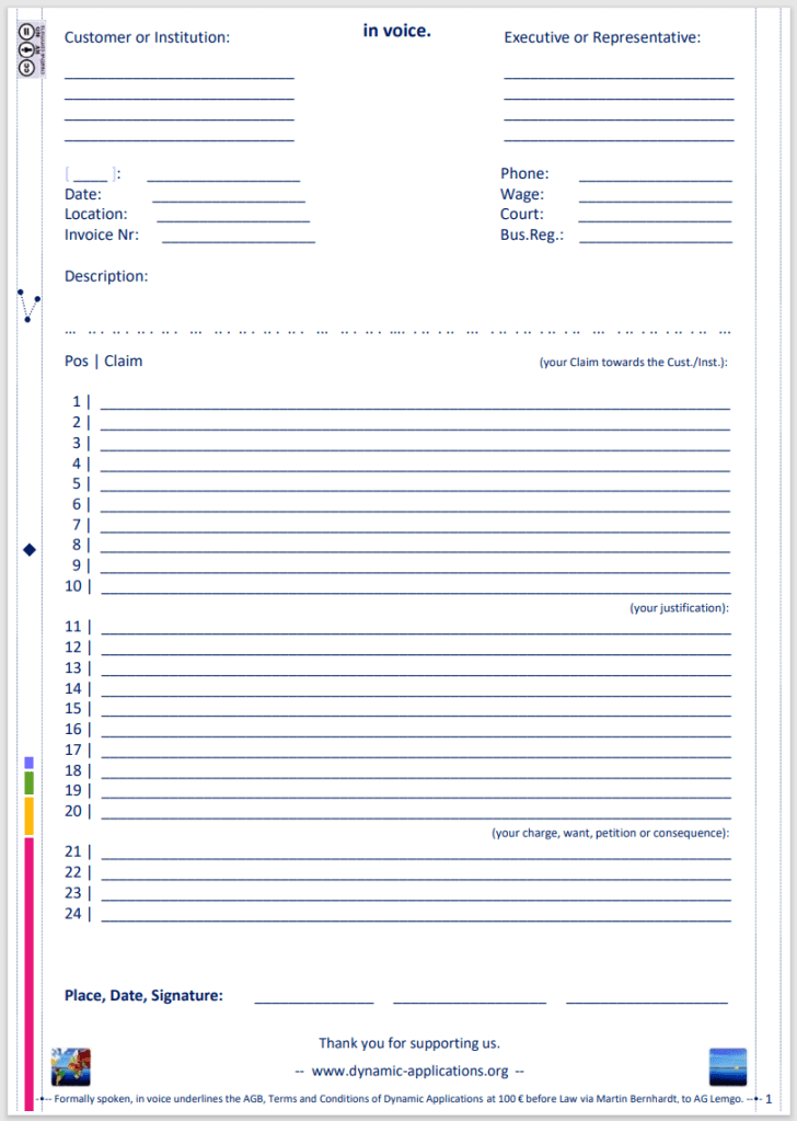 In an attempt not to carelessly interfere with the rights of others (your own rights), in defining our own AGB, Terms and Conditions, we have actually oriented ourselves closely upon the Constitution of the Federal Republic of Germany. So we have moved ourselves in an optimal, neutral position. From there we contribute to Society and anyone’s benefit by providing the basic scope of our work, free of Charge. Should you find this any interesting, you are invited to become part of Dynamic Applications, e.g. by signing our AGB, the dna license, or installing the software.