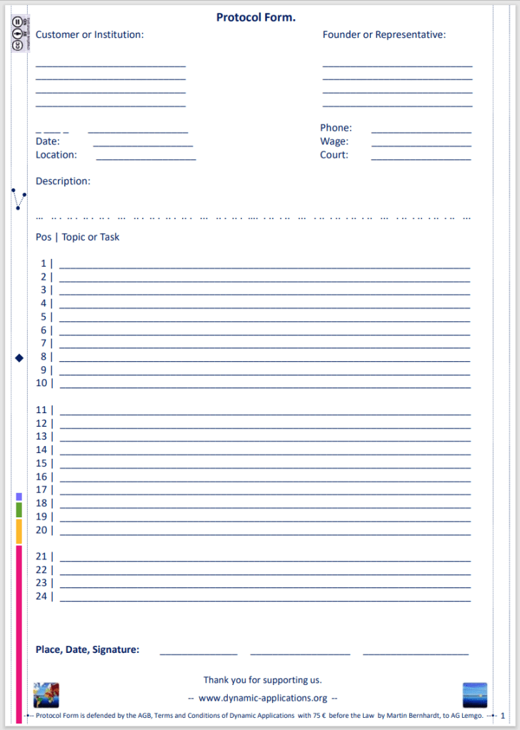 In being the Founder of Dynamic Applications, so am i willing to defend each Protocol Form Template with 75 € before the Law, to AG Lemgo (the local Court). Should you ever be angry about our (my) personal service, it’s your good right to send a letter to AG Lemgo with a written complaint, by German Law (we recommend to relate to the Articles of Constitution, as defined in our AGB, Terms and Conditions). Should the Court accept, 75 € shall be granted to you. I’ll bring that in bank notes in my own pocket. So your basic travel expenses shall be paid.