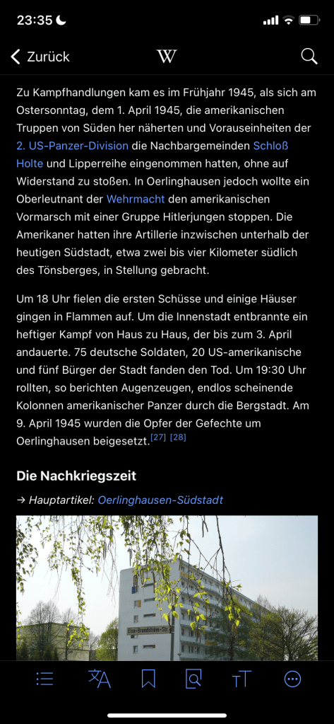 in March 1945, an Oberleutnant of the German Army decided to defend the town with a bunch of „Hitlerjungen“ (Young Men). So when the U.S. Army arrived on 31st March, a severe fight started for House to House, until the town was occupied on April 1, 1945 by the U.S. Army.
