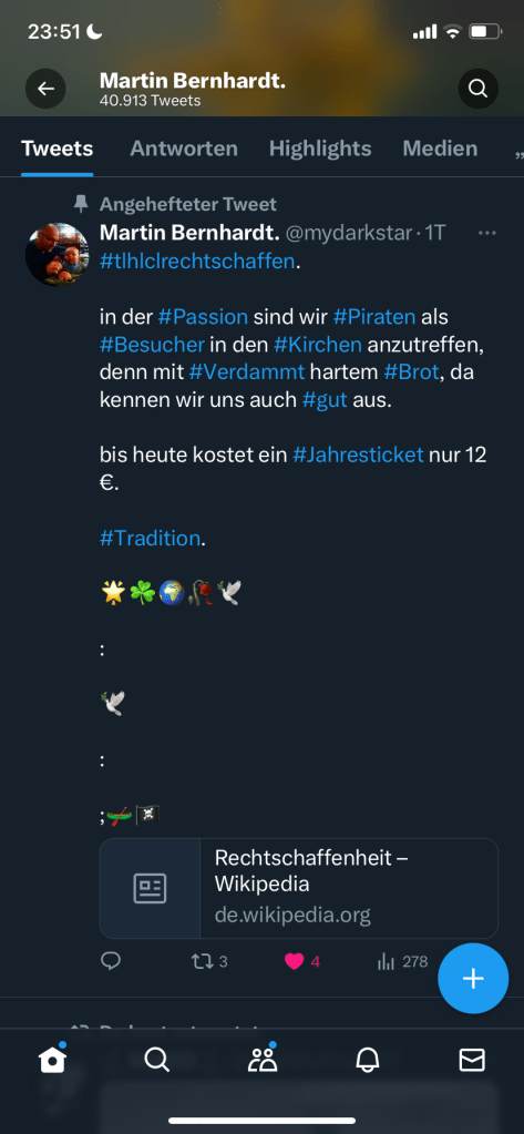 finally, a word towqrds the Nazi guys. At the Pirate Party, we see it so that there is Freedom before Law, and that there shall be Meinungsfreiheit (Expression of free speach) and no Censor ship in general. Every one is residing on their own ‘Houseboat’ (a typical Pirate Party member expression for ‘i am speaking from Home’, in Mumble, a program where we talk upon). However, it is quite a common opinion at the Pirate Party that there should be a severe ‘Brandmauer’ (Firewall) towards the AfD, the Alternative for Germany, a popular party (5 .. 10 .. 20 .. 32 .. %). On the other hand, it is also an opinion with the Pirate Party that even popular right-wing figures like Björn Höcke shall be allowed to sit down and so get a chair, at the Pirate Party congress.