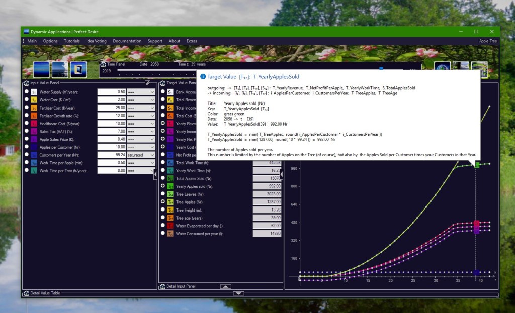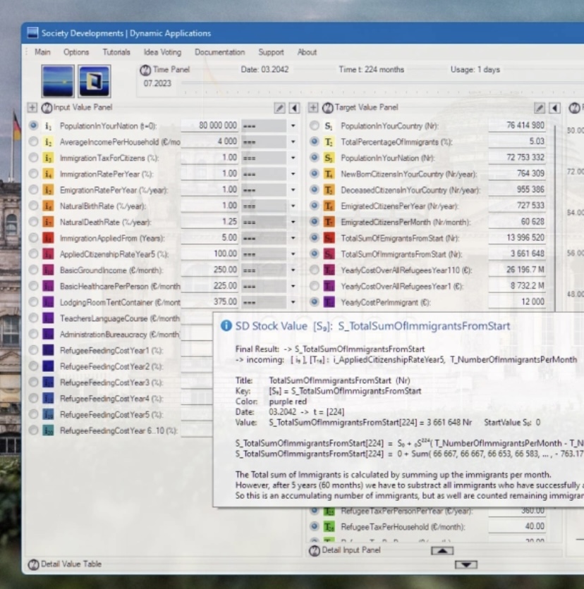 So we have developed Society Developments well in thought that there may be, well be other Political Systems around the globe where Dictatorship, Tyranny and War are people’s daily habit. To protect our users from Surveillance of any kind, Dynamic Applications share no data at all. We develop proprietary Desktop calculators that are resolved by a small, self developed Differential Equation Solver for the resolution of all calculation formula and the automatic sum-up of all accounting Targets, which we call Stock Values. Just like in a Stock of Bees, these sum up all values of a Target, as arriving over Time. We use them to account Population, Migrants, Refugees, Budgets, Downloads, People living in a Country at a Time. Cost and Profit of a Bakery, or even a Photovoltaic System, a Wind Turbine, a candle, a bread, some honey.