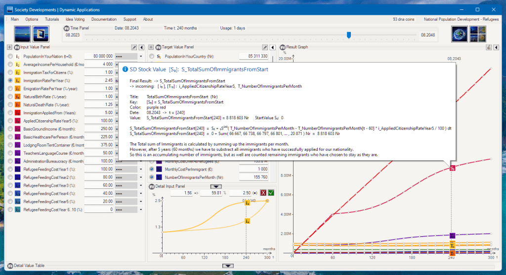 That’s why we have chosen 1000 € as a default value for a working Migrant, as well as for a Refugee’s supply. In Year 1, Year 2, Year 3, Year 4, Year 5, with our Refugees calculation, we can enter how much budget shall be spent on helpless people in the coming up years.