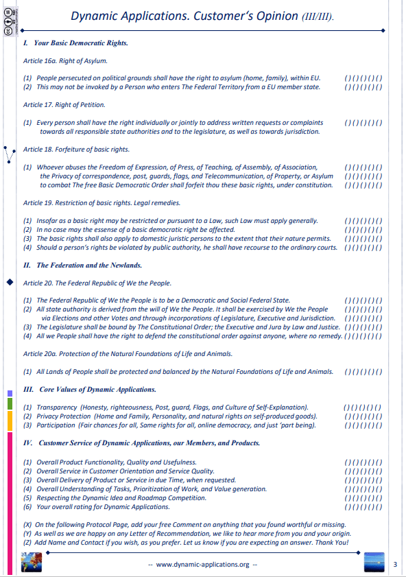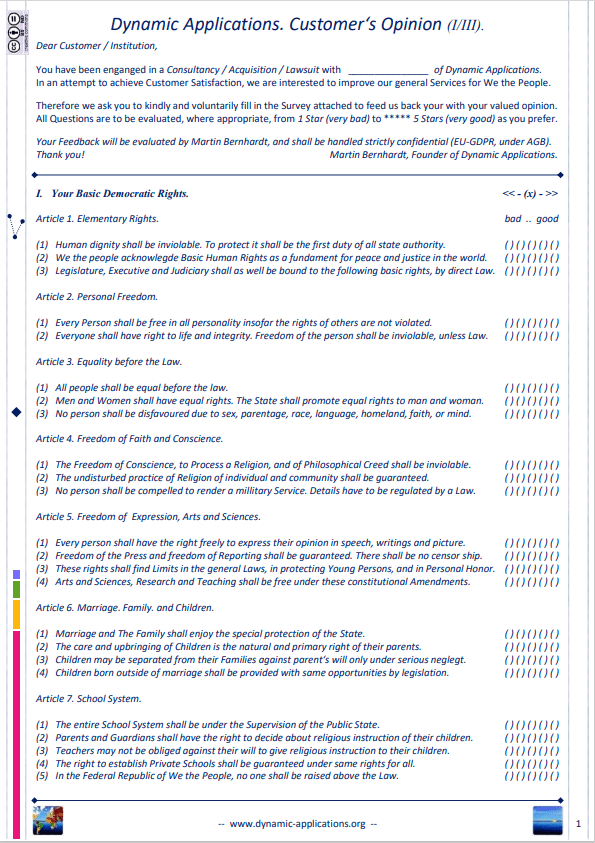 The core values of Dynamic Applications are Transparency, Privacy Protection, chance, and Participation, to day. See AGB for our ethical guideline, in daily work. Here we define additional clauses (Amendments) towards the Constitution of the Federal Republic of Germany.